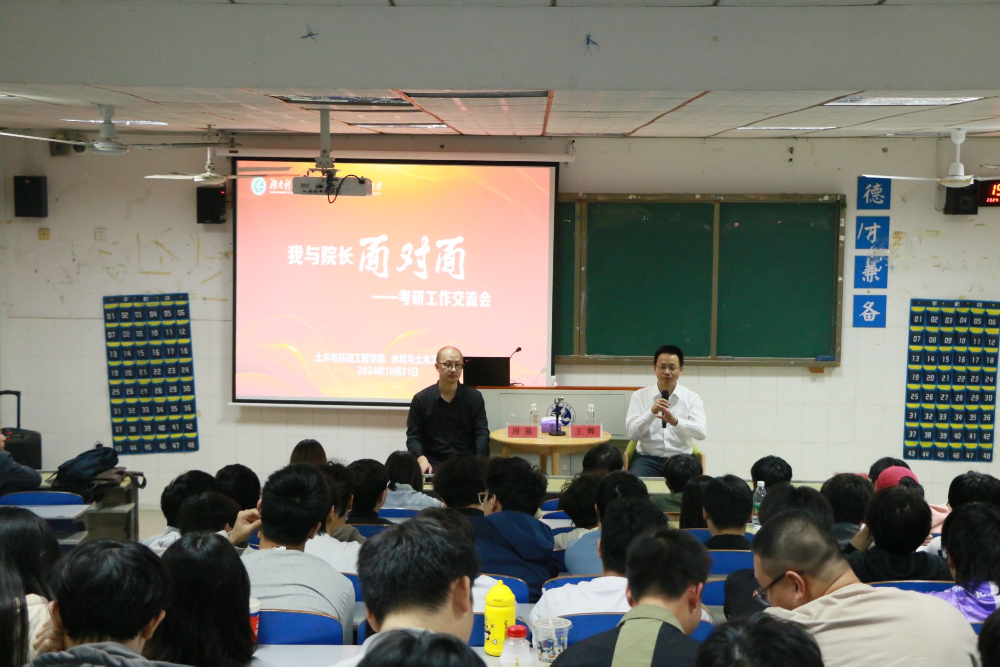 交流会上,王辉和周基对当前土木类考研形势进行了认真分析,指出了考研的重要性以及本学院学生在考研中的优势与不足。周基强调,考研不仅是一场知识的较量,更是一场心态与策略的博弈。王辉就湖南农业大学水利与土木工程学院的专业与学科优势展开宣讲,热烈欢迎同学们报考。在交流环节,同学们踊跃发言,两位院长结合事例,就如何确定考研目标、如何备考、复试技巧等方面进行积极探讨和答疑解惑。
