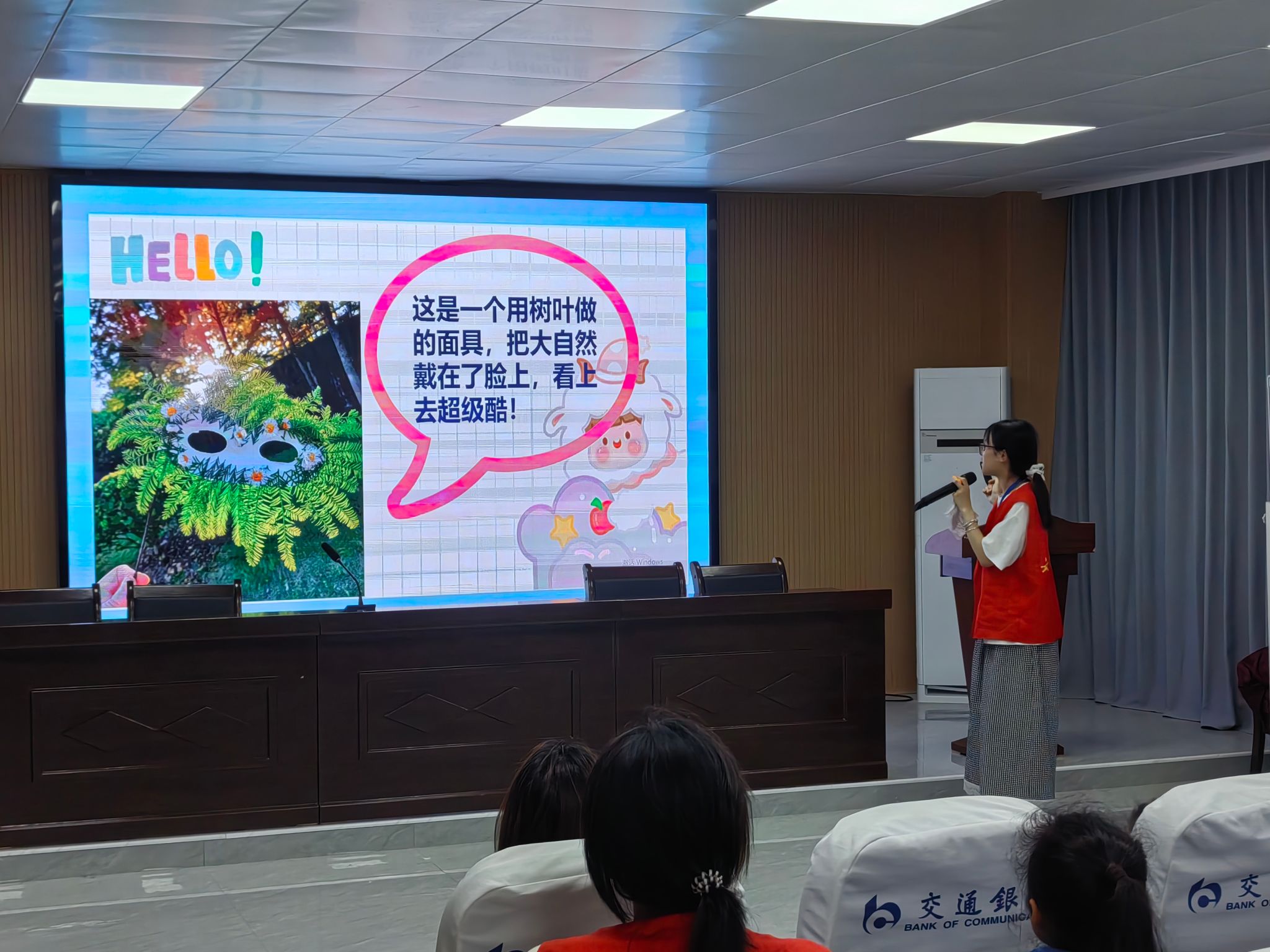 活动现场,大学生们团队以树叶为“天然教具”,展示梧桐、银杏等12种树叶标本,通过“叶脉纹理观察—叶形联想—艺术创作”三环节启发想象。学生们用枸骨叶拓印出“骑士铠甲”面具,松针拼贴星空、枫叶拓印出火焰。“不限制模板,才能让自然素材激活创造力。”该课程指导教师王艺老师介绍说。