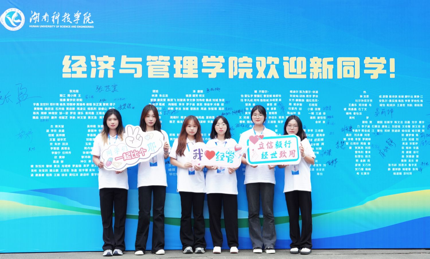 学院还将413 位新生的名字精心制作成“立信毅行”主题宣传板,成为迎新现场一道温馨而亮丽的风景。新生们纷纷驻足观看,感动与惊喜溢于言表:“天哪,这也太浪漫了!”此外,学院还特别设置“心语信箱”,鼓励新生写下对大学生活的期待与梦想。一字一愿,皆是新篇;一名一梦,共启韶华。