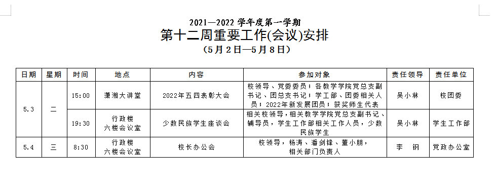 [党政办]第十二周重要工作(会议)安排(5月2日-5月8日)